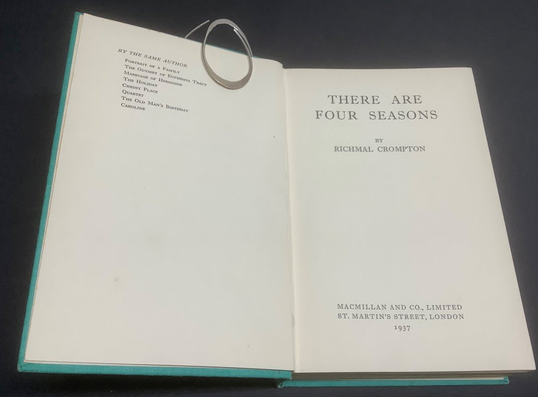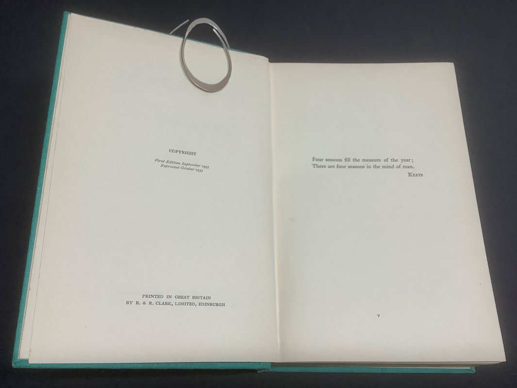 Reprint (October 1937, First Edition, September 1937) 8vo. green cloth hardback, gilt, lacking dust jacket. 317pp. Small neat ink name and date (1942) to ffep. Light foxing to endpapers and foredge. Very slight forward lean. Slight wear to top and base of spine. Overall a Good+ Copy.