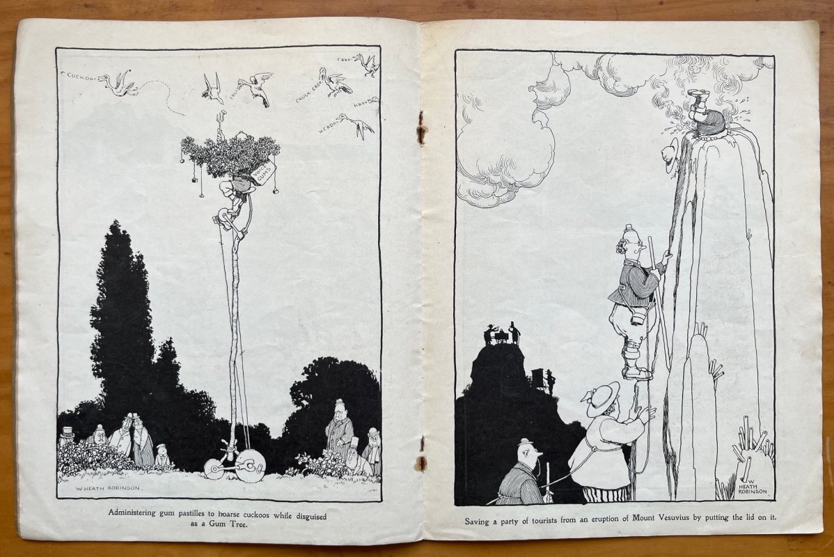 FIRST EDITION Stapled softback (approx. 27.5 x 21.5cm) with illustrated card covers. Pages unnumbered. Features 20 full-page line drawings by W. Heath Robinson plus 2pp. Advertisments. A clean copy with no previous owners' markings or inscriptions. Covers somewhat darkened with light soiling and edgewear. A Good+ Copy.
