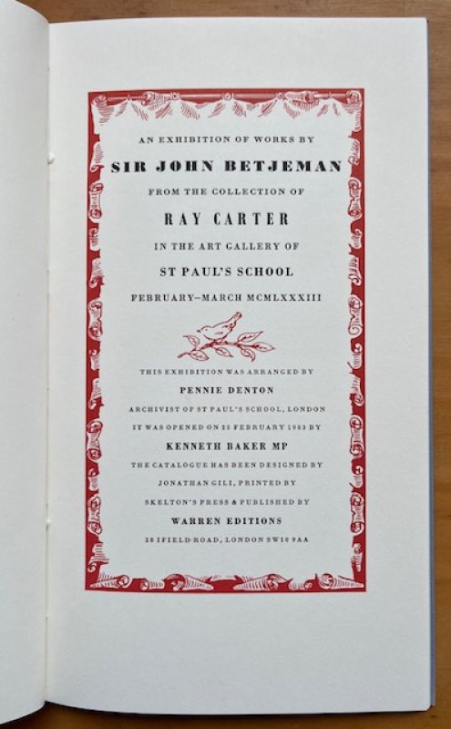 AN EXHIBITION OF WORKS BY SIR JOHN BETJEMAN: From the Collection of Ray Carter in the Art Gallery of St. Paul's School February - March MCMLXXXIII With an Unpublished Poem. Illustrations by John Piper, Phillida Gili & Glynn Boyd Harte and an Introduction by Philip Larkin.