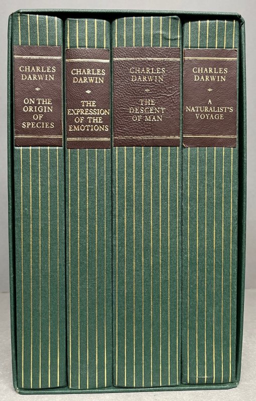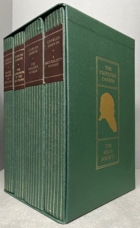 FIRST THUS 4 Volumes in Slipcase. 8vo., dark green clothbound hardbacks with brown morocco title labels, gilt, and gilt lines to spines, gilt lines and silhouette to upper boards, in matching dark green cloth slipcase, gilt. With b/w portrait frontipiece to all volumes and b/w illustrations to all but On The Origin of Species. A clean set with no markings or inscriptions. Some foxing to foredges and inside of slipcase. One corner of title label to A Naturalist's Voyage just lifting. One top corner of slipcase a little crushed. Overall a VERY GOOD SET in GOOD+ SLIPCASE.