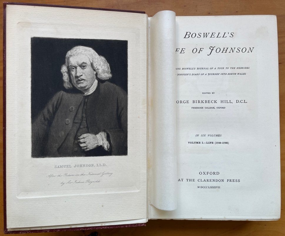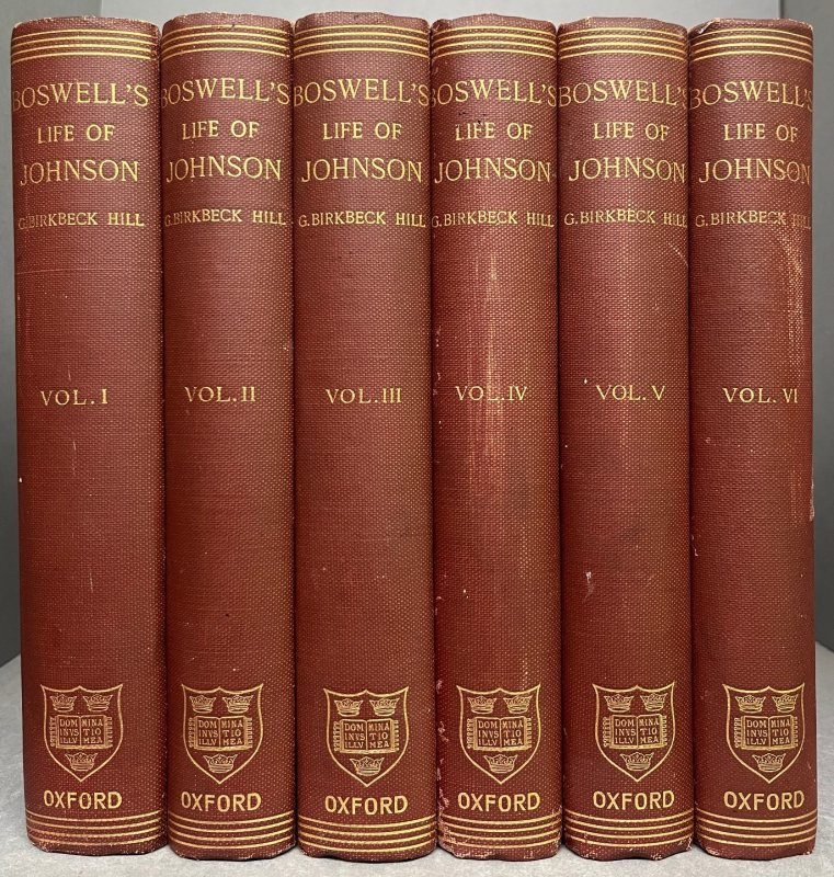 FIRST EDITION Edited by Birkbeck Hill. 6 Volumes, Complete. 8vo. brown cloth hardbacks, gilt. t.e.g. Illustrated with 6 portraits, 6 folding facsimiles of handwriting and letters, a Map of the Tour through Scotland and the Hebrides and a Chart of Johnson's Contemporaries. Some tanning to endpapers and occasional light foxing, mainly to prelims. Small modern bookplate to foot of front pastedown of each volume. No other markings or inscriptions. Slight fading and spotting to board edges and slight rubbing to spines of Vols. Iv, V and VI. Overall a VERY GOOD SET.