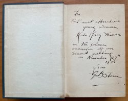 FIRST EDITION. SIGNED, PRESENTATION COPY. 8vo. blue cloth hardback, gilt. No dust jacket. 350pp. With long ink presentation inscription from the Author to another author, Kate Mary Bruce ('that most attractive young woman') to ffep. No other markings or inscriptions. Slight tanning to endpapers and foredge. Slight worming to foot of first few pages. Some fading to cloth spine with very slight wear to top edge. A few faint marks to upper board (please see photos). A VERY GOOD COPY with an interesting inscription.