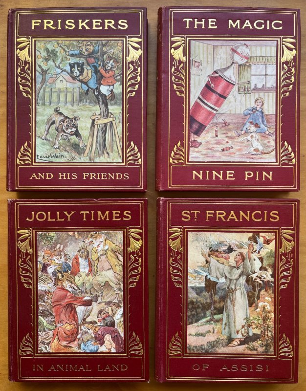 4 Volumes in decorative Display Case. 12mo. red cloth hardbacks with decorative gilt to spines and upper boards, and colour illustrations laid-on to upper boards. In a matching red buckram covered display case with decorative School Prize label in gilt on dark red buckram laid-on to base. Inside of display case lined with grey/green floral patterned paper. Friskers: 154pp., illustrated with 16 colour plates by Louis Wain. Magic Nine-Pin: 158pp., illustrated with 15 colour plates by Kathleen Hawke (Author). Jolly Times: 126pp., illustrated with 16 colour plates, with inscribed School Prize bookplate, dated 1913, to ffep. St. Francis: 158pp. plus 2pp. Advertisements, illustrated with 8 colour and 8 b/w plates. A clean set other than the School Prize bookplate in Jolly Times.Slight wear to top and base of spines, slight wear to interior of display case and very slight external wear. Overall a VERY GOOD, HANDSOME SET in GOOD+ DISPLAY CASE.