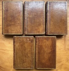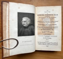 A NEW EDITION with Copious Notes and Biographical Illustrations, by Malone. 5 Volumes, Complete. 18mo. full calf, professionally rebacked with original spines laid on. Decorative gilt to spines, blind-stamped decoration and gilt borders to boards. Volume I: 342pp. with engraved portrait frontispiece (dated 1819) and 2pp. facsimiles of Johnson's handwriting. Volume II: 360pp. Volume II: 359pp. with folding illustration of Round Robin addressed to Samuel Johnson with facsimile signatures. Volume IV: 395pp. Volume V: 365pp., Indexed. Small engraved bookplate to front pastedowns and engraved armorial bookplates to most ffeps. Light foxing and offsetting to prelims and offsetting from portrait frontispiece to title page of Volume I. Otherwise internally clean and bright. Some rubbing and wear to original spines laid on (please see photos), otherwise a VERY GOOD, HANDSOME SET.