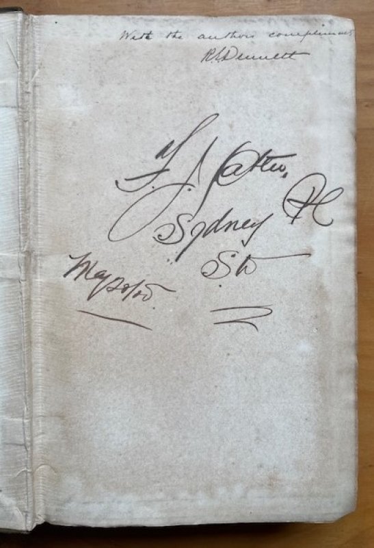 FIRST EDITION, SIGNED, PRESENTATION COPY. 8vo. olive green cloth hardback, gilt. No dust jacket. 288pp., Indexed, profusely illustrated with b/w plates, line drawings and maps. Inscription to ffep reads 'With the author's compliments R. E. Dennett'. With large calligraphic name and address below. Occasional light foxing and handling marks, heavier to prelims and untrimmed foredge. Some wear to spine edges with slight fraying to cloth. Top outer corner of upper board bumped and other corners rubbed. A Good + Copy.