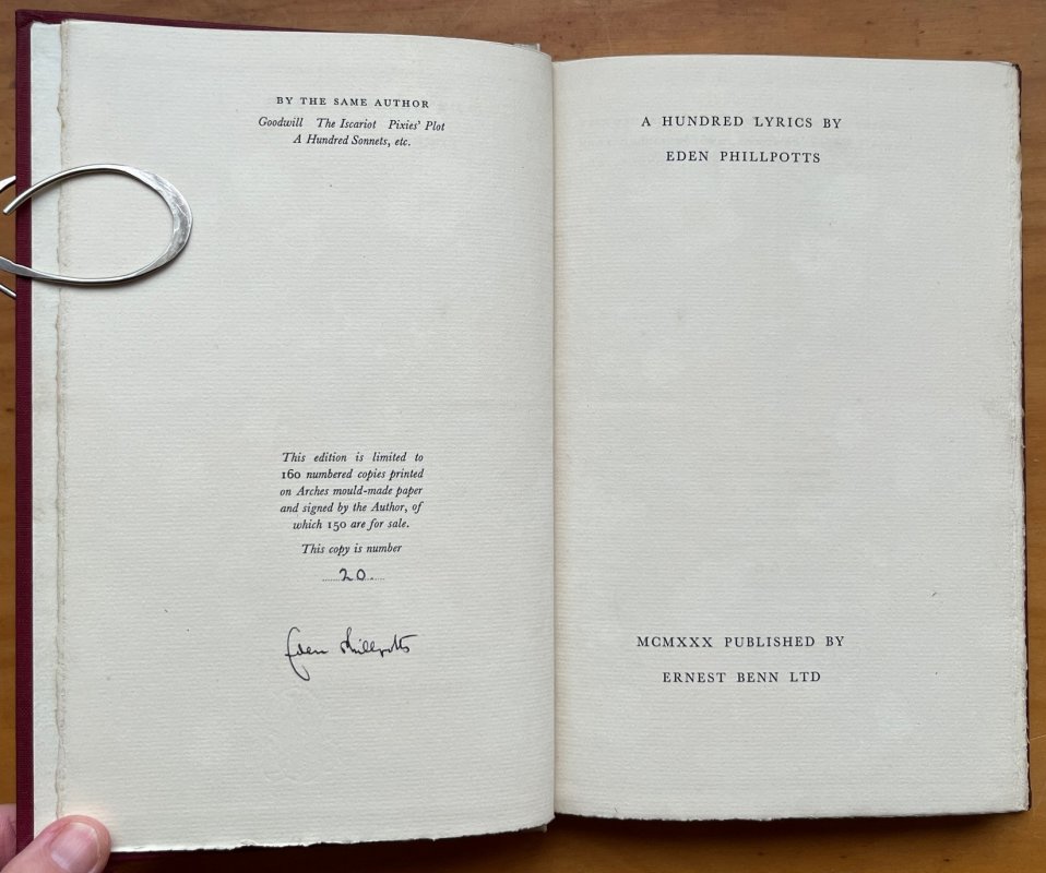 SIGNED, LIMITED EDITION No. 20 of 160 copies. 8vo. hardback in quarter vellum with green titles to spine, and dark red cloth-covered boards. t.e.g. Other edges deckled. Pages unnumbered. Signed in ink by the Author to Limitations page. Ink name and address, dated 1942, to ffep. Tanning to free endpapers and deckled edges. Slight spotting to vellum spine, else a VERY GOOD COPY.