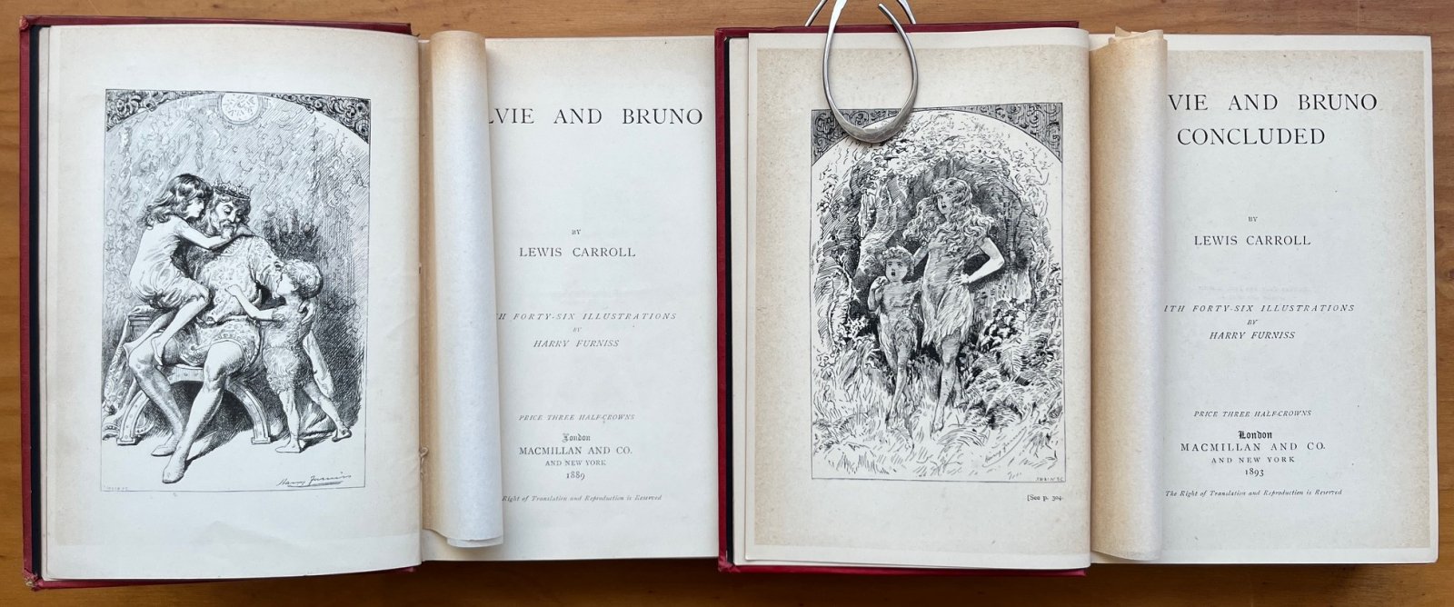 FIRST EDITIONS 2 Volumes. 8vo. original red cloth hardbacks with gilt titles to spines and gilt vignette decorations to upper and lower boards. a.e.g. Volume I: xxiii, 400pp. plus 3pp. Publisher's list, with 46 illustrations by Harry Furniss including tissue-guarded frontispiece. Volume II: xxiii, 423pp., Indexed, plus 4pp. Publisher's List and 1 Specimen page from Alice's Adventures Underground (a facsimile of the original MS) at the end. Also with 46 illustrations by Harry Furniss including tissue-guarded frontispiece. Volume I has ink signature and date (1892) to ffep and faint remains of erased pencil notes to facing blank. Front inner hinge a little weak. Spine a little darkened with wear to edges including some splitting to cloth. Corners also rather rubbed. Volume II a clean copy with no markings or inscriptions. Binding nice and firm. Slight fading to spine and faint crease to upper board. Overall a Good+ Set.
