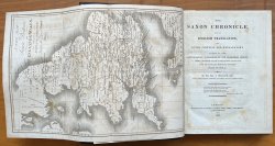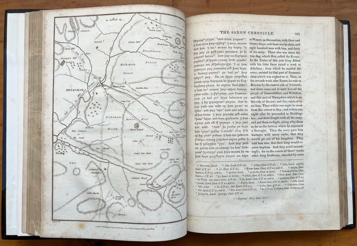 FIRST EDITION IN MODERN ENGLISH 4to. hardback in modern rebinding of half black leatherette, gilt, and blue buckram boards. New endpapers. All edges with original marbling. xxxii, 463pp., Indexed, with large folding map, dated 1819, as frontispiece, a Facsimile of MSS, a Map to illustrate the IGLEA of the Saxon Chronicle and 3 plates of Coins. Text in 2 columns, Anglo-Saxon and modern English. A clean copy with no markings or inscriptions. Occasional light foxing, mainly to prelims. Lower corner missing to p.405 but no loss to text.
